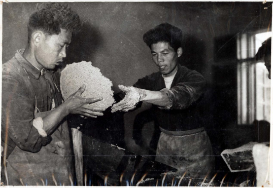 图丨古井酒厂建厂初期,聂广荣(右一)与工人一起劳作