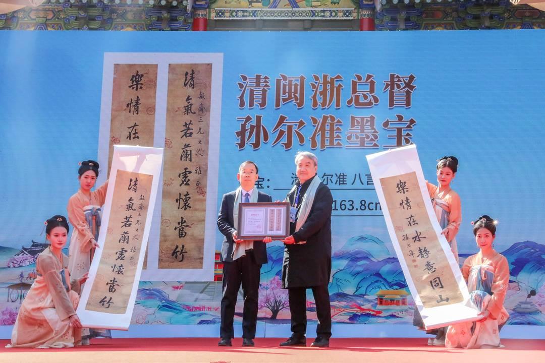 开幕仪式上,单成彪代表书画爱好者向汾酒捐赠清闽浙总督孙尔准书法楹联。