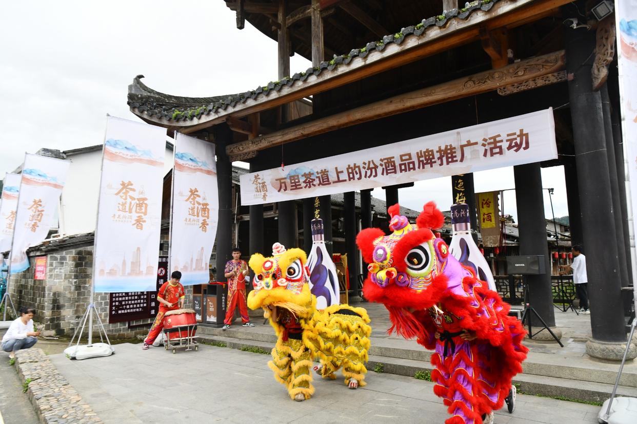 武夷山的茶叶最早从陆路走出国门。地处武夷山梅溪下游的下梅村,是万里茶道的起点。茶香酒韵,舞狮鸣锣,当日上午10时许,“茶道酒香汾酒品牌推广活动”在下梅村盛大启幕。 “一点左眼,观茶道千年,启文化传承;二点右眼,望酒香万里,开品牌新篇;三点额头,聚晋韵匠心,佑汾酒远航” ,点睛环节,主办方领导手持朱砂笔,为雄狮“点睛”。在一片喝彩声中,完成点睛的雄狮猛然跃起,随着铿锵的锣鼓声,舞狮表演队惊艳亮相,腾挪跳跃,时而威风凛凛,时而憨态可掬,点燃全场热情。