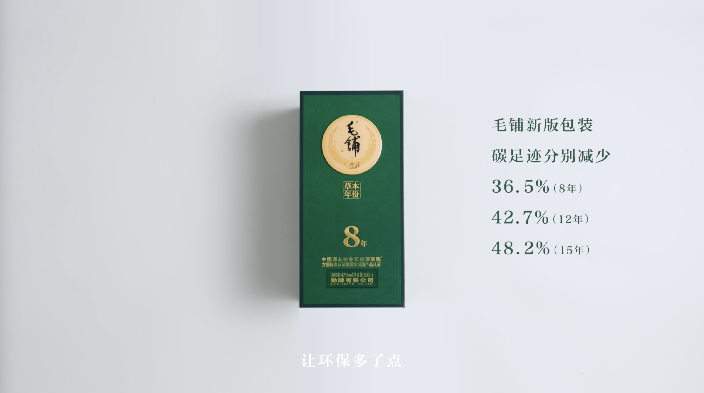 通过工艺的优化与升级,毛铺草本年份酒实现了不同年份产品碳足迹分别减少36.5%(8年)、42.7%(12年)、48.2%(15年),具像化呈现了毛铺践行环保理念与企业社会责任的担当,让用户的每次消费都成为可感知的环保贡献。
