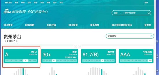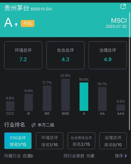 据新浪财经ESG评级中心显示,贵州茅台在MSCI的ESG评级已升为A级别,ESG总评排名白酒行业首位。