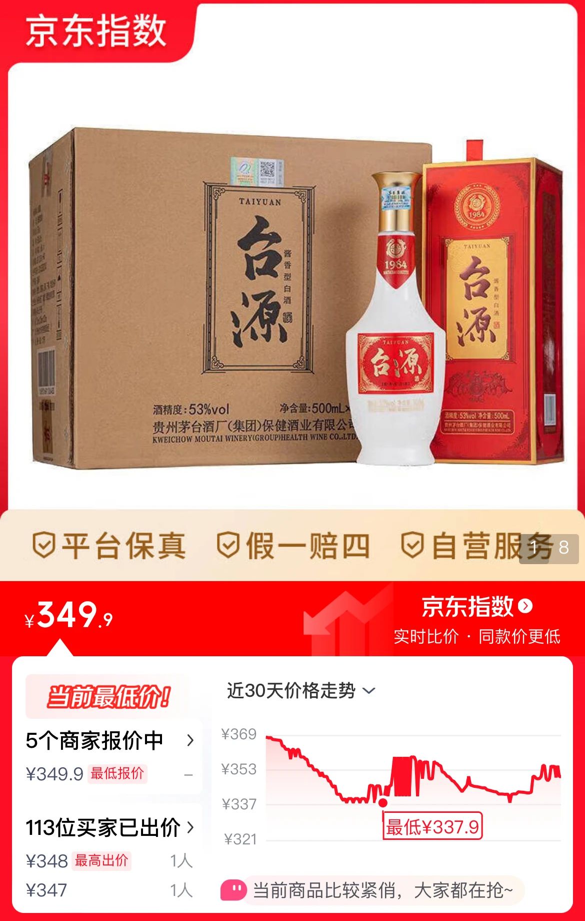 然而,耀眼的数据难掩渠道的暗流涌动,距其高光时刻不过短短两年,《华夏酒报》记者调查发现,在京东等主流电商平台,台源酒单瓶售价已滑落至官方定价的四成。以京东平台为例,截至发稿时,一箱台源酒(53°500ml*6)实时售价为349.9元(约合58.2元/瓶),近30天最低价更低至337.9元(约56.3元/瓶)。