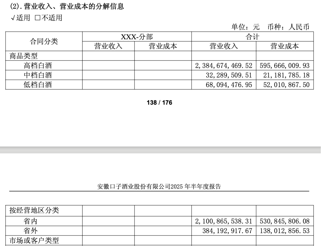 具体来看,口子窖高档白酒营收为23.85亿元,同比下滑19.8%;中、低档白酒收入降幅相对较小,分别同比下滑10.82%、2.59%,营业成本均大于营业收入,陷入越卖越亏的泥潭;省内和省外营收同比下滑分别为19.31%、19.24%。