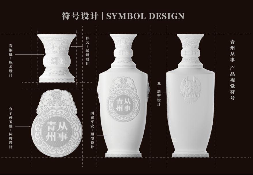 标牌设计以青州博物馆、东汉宜子孙玉璧为蓝本,与青州从事、云门酱酒、龙纹吉祥纹等元素融合,玉本身所代表君子之品德,与酒文化的礼仪、祝福等相得益彰,进一步丰富了产品的文化层次。