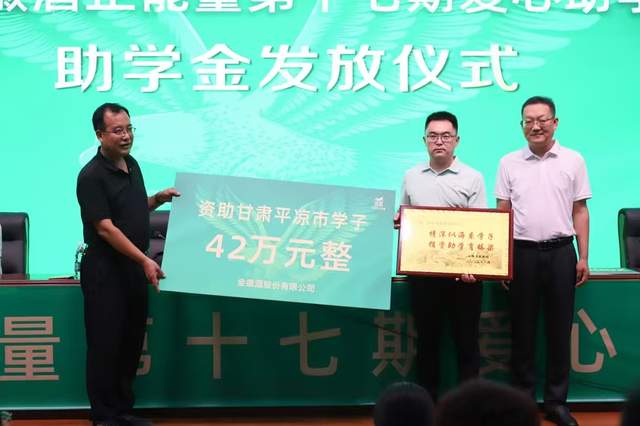 7月31日,金徽酒正能量第十七期爱心助学金发放仪式在内蒙古呼和浩特市回民中学举行,现场向20名优秀高中毕业生发放4万元助学金。