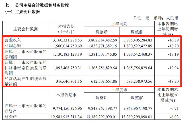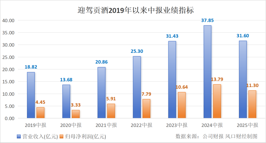 8月25日晚间,作为“四大徽酒”之一的迎驾贡酒披露2025年半年度报告。报告期内,公司实现营业收入31.6亿元,同比下降16.89%;归属于上市公司股东的净利润为11.3亿元,同比下降18.19%。这是其自2020年以来首次半年度业绩双降。