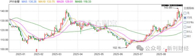 从资本市场表现来看,中报发布后首个交易日,泸州老窖股价报收135.85元/股,当日下跌0.98%,表现在白酒板块中相对落后。不过,若将时间拉长至全年,其当前股价较2025年初的119.25元仍累计上涨13.92%。期间股价波动显著,区间最高触及143元,最低下探至102.16元,振幅达39.98%,呈现出多次震荡的走势特征。