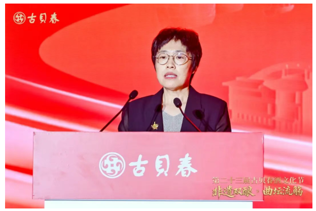 古贝春集团有限公司党委书记、董事长徐秀菊首先致辞。她回顾了古贝春扎根运河文化、坚守百年匠心的企业发展历程,强调在“守正创新”理念引领下,企业不仅以“双轮固态发酵”等传统技艺筑牢品质根基,还积极与现代科技融合,实现高质量发展。2024年集团销售收入再创历史新高,品牌价值达223.77亿元,逆势展现出强劲韧性与增长动能。