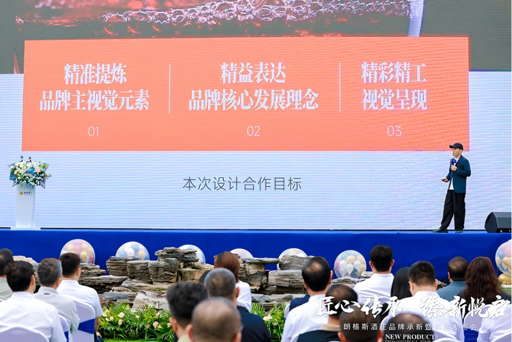 深圳卓上设计创始人武宽夫也从美学出发,分享了新品设计理念,强调在共性与个性之间探寻品牌独有的视觉锚点,以极简而纯粹的设计语言传递朗格斯酒庄深厚的酿造传统与中西交融的文化底蕴。通过提炼品牌建筑中的欧洲浪漫诗意元素,融合现代东方审美,塑造出高端多元、易识易记的品牌视觉系统,诠释了朗格斯“品牌logo是最重要的品牌印记”,使每一款新品不仅承载风土之美,更成为连接消费者情感与记忆的媒介。