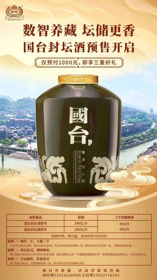 重阳下沙,不仅是茅台镇酱酒生命周期的开端,也是国台对品质的年度宣誓。 10月29日重阳节,国台将举行2026年国台质量誓师大会暨国台珍藏酒封坛仪式。 国台开展封坛酒业务已有十余年,