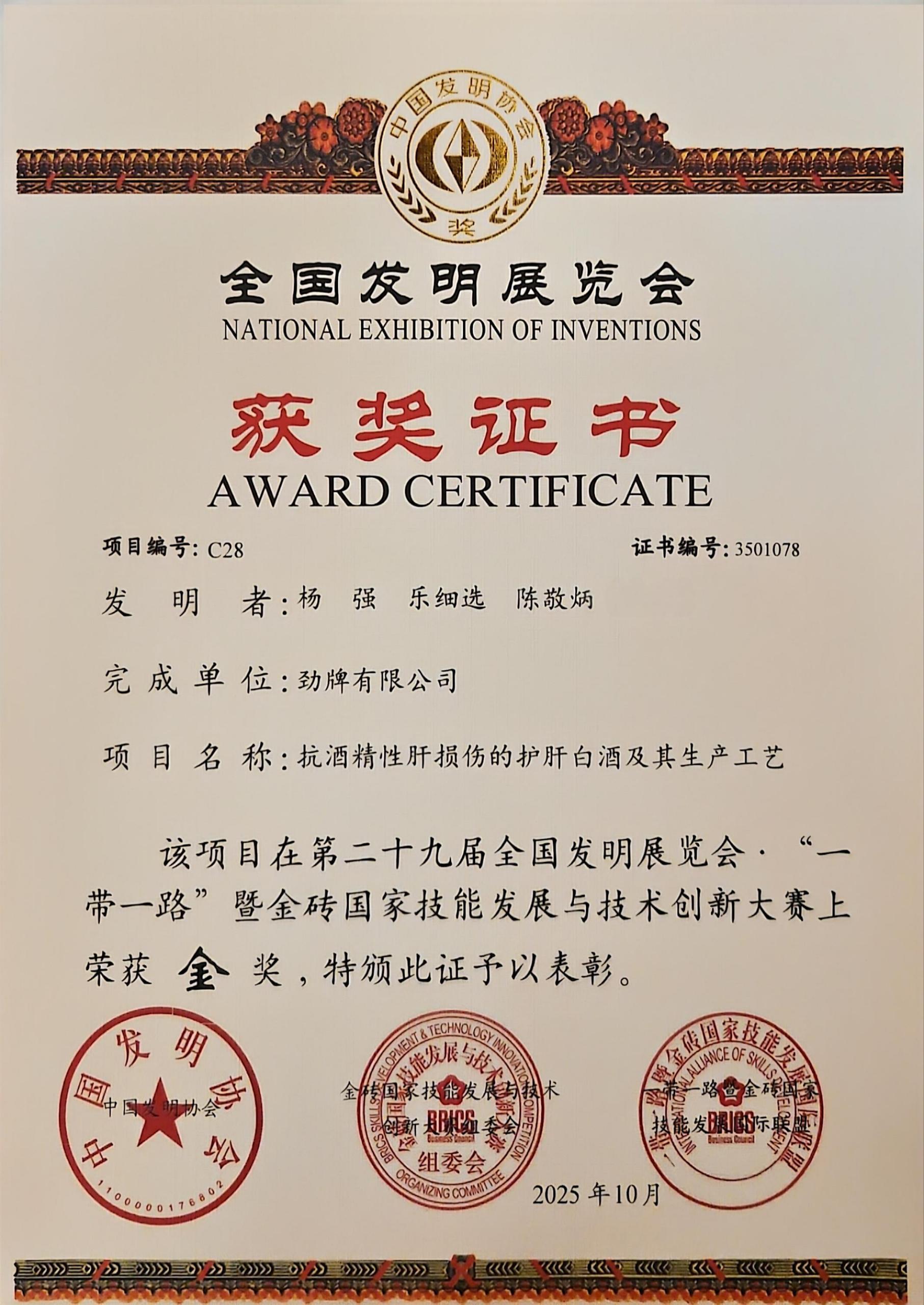 劲牌在第二十九届全国发明展览会 “一带一路”暨金砖国家技能发展与技术创新大赛中荣获“一金一铜”