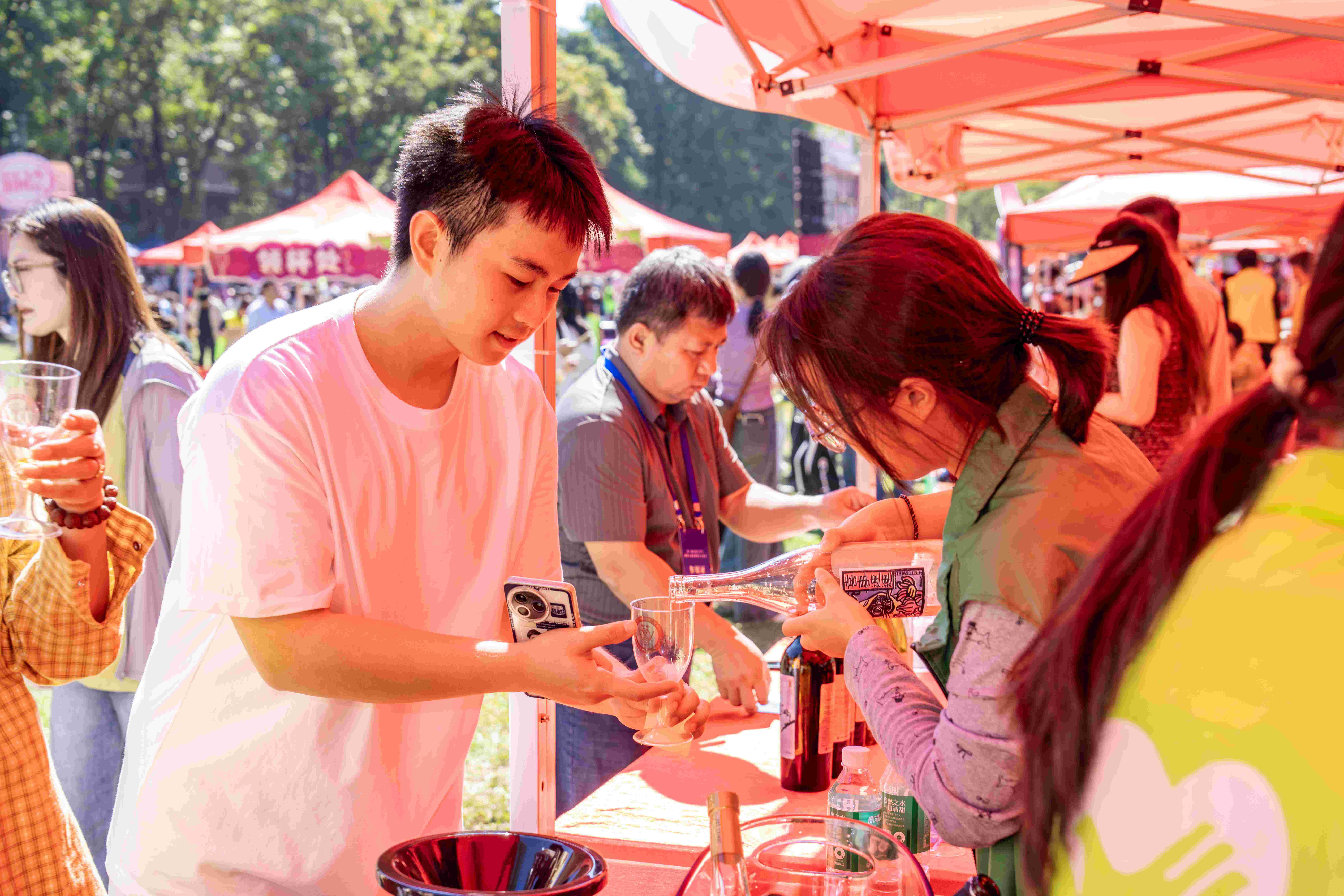 各色佳酿在酒杯间流转,葡萄酒香令空气微醺……葡萄与葡萄酒科学文化游园会暨粤菜美食嘉年华现场人头攒动,参会本土葡萄酒企业拿出好酒供游客现场品鉴,华农各大食堂美食带来舌尖盛宴,现场同步布置“举杯贺兰山——微醺纷玩岛”专题活动、宁夏产区葡萄藤认养展区、“天山杯”全国大学生葡萄与葡萄酒艺术创意大赛作品展、华农校友企业展、华农优品展,吸引了众多师生、校友和市民前来参观游玩。