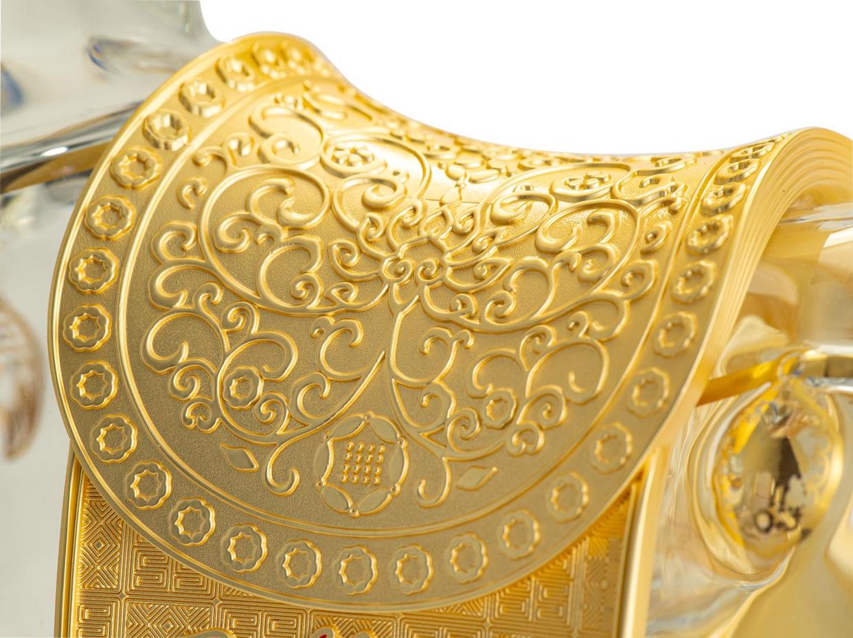 在工艺上,“飒露紫”由工龄近20年的工匠师傅手工打造而成,为水晶玻璃材质,晶莹剔透十分美丽。尤其是骏马的四肢、鬃毛和尾巴,点缀了少许的蓝紫色,这是五粮液首次将“双色渐变玻璃工艺”运用到生肖酒上,既增添了灵动和神韵,又让中国传统色彩得到传承和彰显。此外,“飒露紫”马栓印有“马到成功”印章,马鞍是“宝相花+五谷文”设计,祝福“吉祥如意、五福临门”,并且工艺上还使用了大量描金工艺,更显尊贵气质。