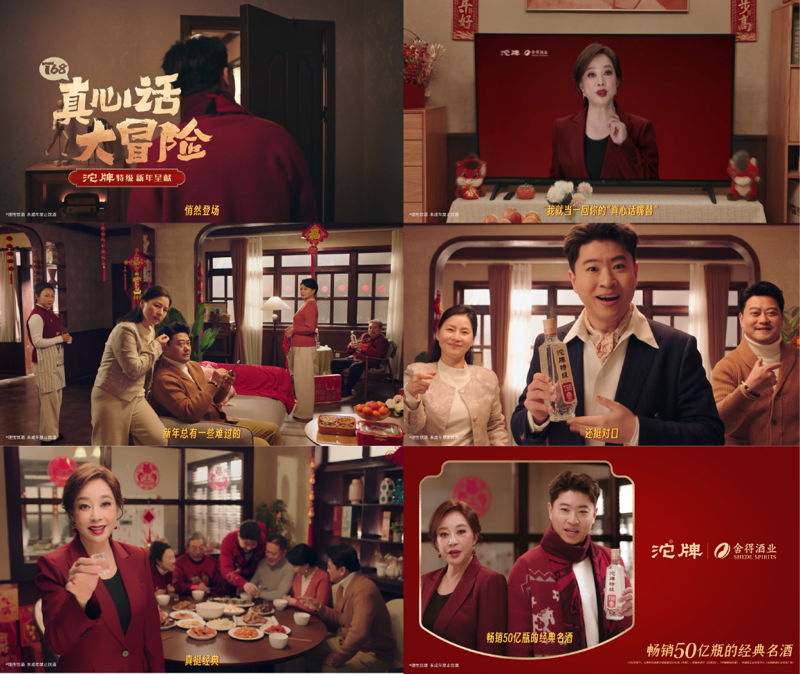 1月29日,沱牌正式发布贺岁大片《T68真心话大冒险》。在片中,刘晓庆化身帮年轻人说话的“明理长辈”,杨雨光扮演被长辈围堵的“返乡青年”,“特级嘴替”组合用幽默犀利、反差机智的语言巧妙化解被催婚、问收入等尴尬,替当代年轻人说出那些难以宣之于口的“真心话”。片中两位“特级嘴替”的爆梗金句,精准刺中春节真实社交情景,引发强烈共鸣,被网友誉为“互联网最强嘴替”“我的互联网替身”。而沱牌特级T68,则作为贯穿始终的情感纽带和沟通媒介,成为鼓励开麦、化解尴尬的“社交溶解剂”。