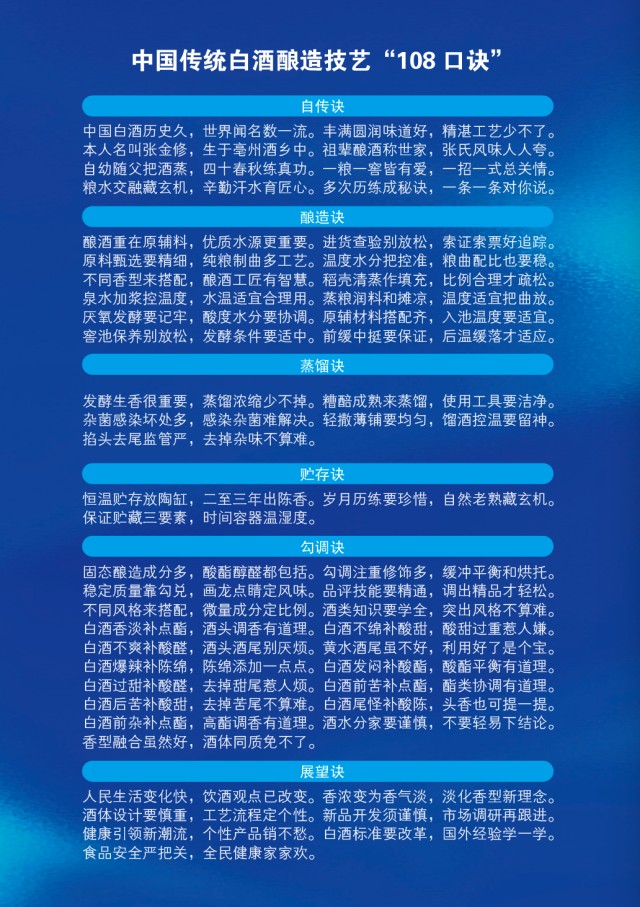 “108口诀”作为全国《浓香型白酒生产技术操作规范》团体标准的重要参考文献,不仅是一套实用的技术指南,更承载着深厚的白酒文化内涵。自传诀中“本人名叫张金修,自幼随父把酒蒸。祖辈传下酿酒经,经过实践都成功。一粮一窖皆有爱,一招一式总关情”,生动传递出酿酒世家的守艺初心与家国情怀;酿造、贮存等板块的口诀中蕴含的“天人合一”“道法自然”“精益求精”的哲学思想,更是对中国传统酿酒智慧的高度概括。该口诀实现了“技”与“艺”、“术”与“道”的深度融合,让学习者在掌握酿造技能的同时,深刻领悟酿造背后的文化精神,守住传统技艺的“根”与“魂”。