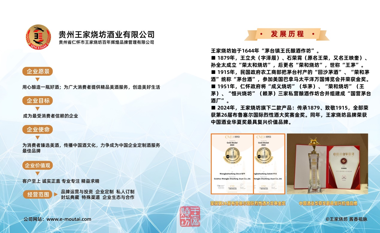 作为贵州王家烧坊酒业的掌舵人,董事长王子阳立足茅台镇7.5平方公里核心酱酒产区,始终坚守“传承为本,创新为魂”的理念。一方面,深度挖掘王家烧坊百年酱香祖脉底蕴,严格遵循12987传统坤沙酿造工艺,在原料、制曲、酿酒、窖藏、勾调各环节精益求精,保障产品高品质;另一方面,他以新锐视角打破传统酒业运营模式,在品牌推广、市场布局、消费者体验等方面大胆创新,带领贵州王家烧坊酒业实现快速发展。在他的运营管理下,王家烧坊凭借醇厚的酒体品质与深厚的品牌文化,迅速在酱香酒市场站稳脚跟,收获了广大经销商与消费者的一致好评,品牌影响力持续提升。