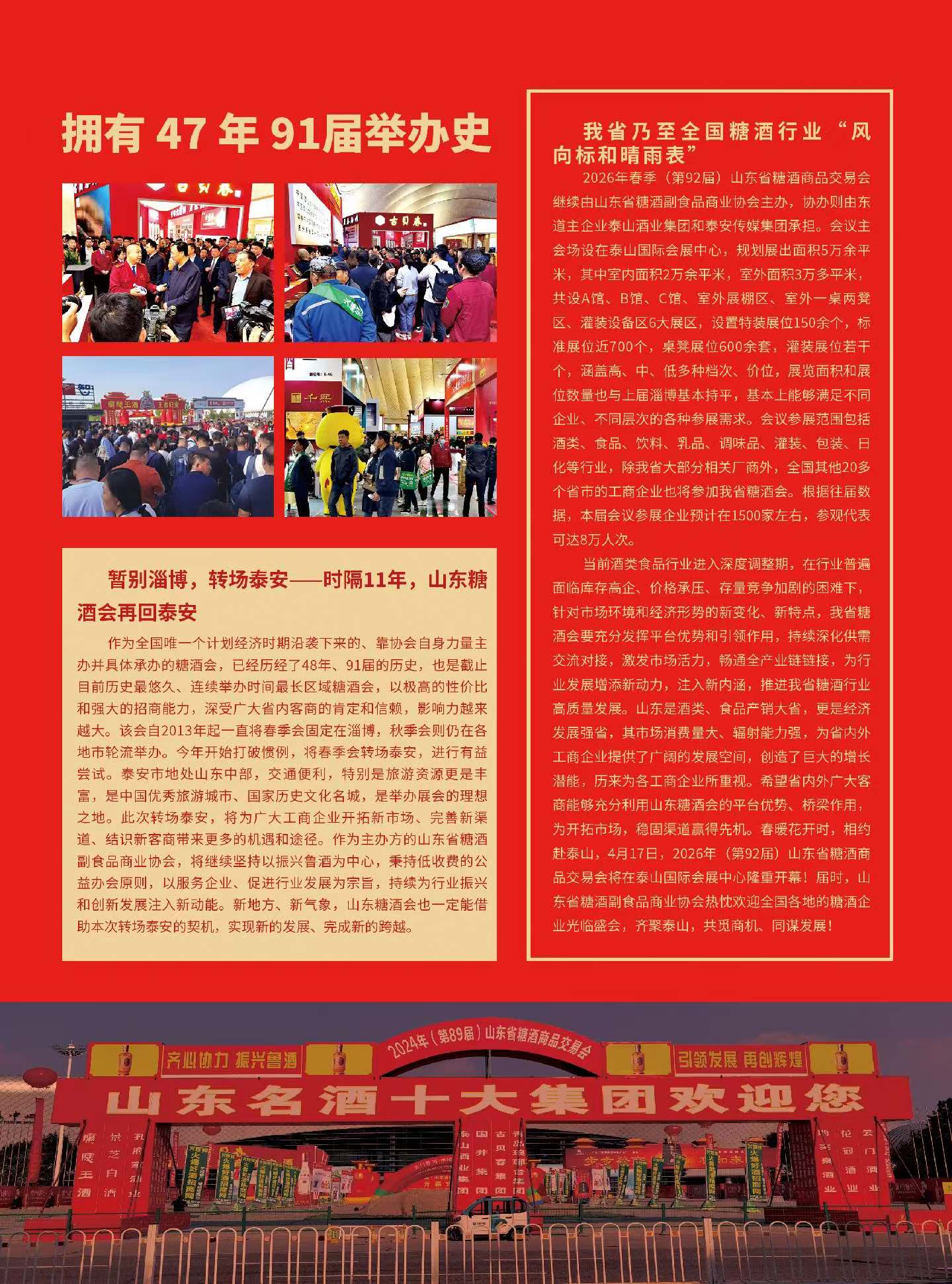 作为全国历史最悠久的区域性糖酒盛会,第92届山东省糖酒商品交易会时隔11年重回泰安举办。本届展会总展出面积超5万平方米,吸引省内外千余家企业参展,将为鲁酒及糖酒食品行业搭建集展示、交流、招商于一体的高效平台。