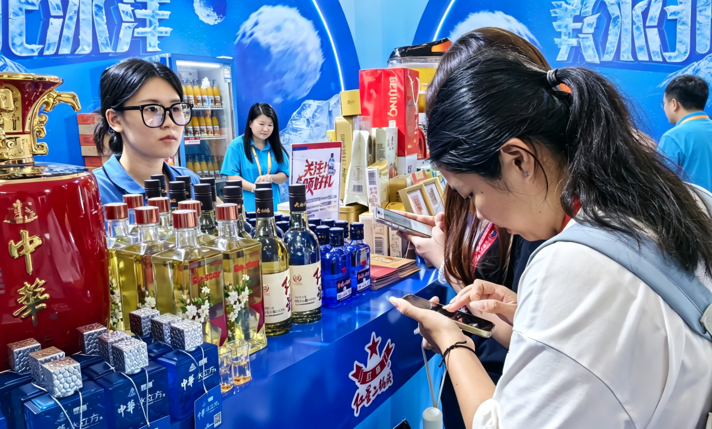 同时红星聚焦年轻消费需求,带来年轻化新品——Re-star(茉莉花茶风味酒),以茶酒融合的清新口感打破白酒饮用边界,契合轻饮潮流;高端光瓶大曲酿同步设置纯饮、调饮体验区,让观众解锁传统二锅头的新潮饮用方式,展现品类创新的更多可能。展区还设置趣味打卡互动,观众拍摄分享即可领取五星胸针、蓝瓶小酒等礼品,以轻量化社交互动拉近与年轻群体的距离。