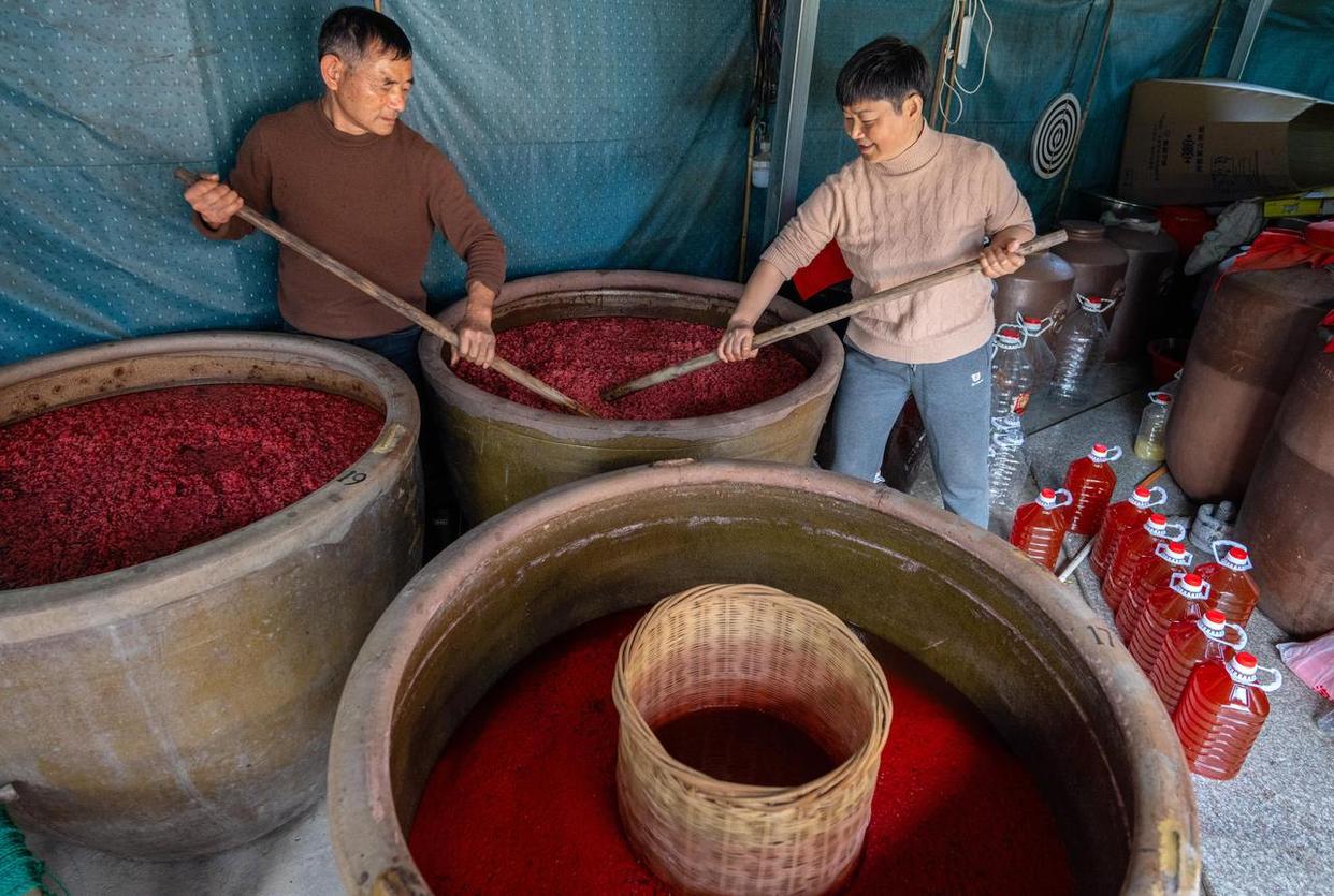 11月24日,湖州市长兴县夹浦镇月明村,村民叶山林通过传统纯手工工艺酿造红曲酒。 江南一带,每年的阳历11月至春节期间,有酿造红曲酒的习俗,寓意新的一年红红火火、顺风顺水。红曲酒是中国传统名酒,其酿造有洗米、泡米、蒸米、翻酒、发酵等近十道工艺,温度、配料比例等直接关系到出酒的品质。