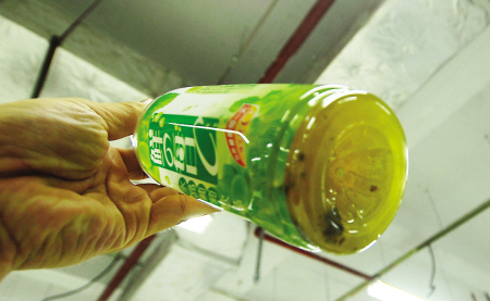 在路边便利店买了一瓶“康师傅”葡萄汁饮料,仰脖喝下大半瓶后,突然感觉有异物,对着灯光细看,竟发现饮料瓶里沉淀有许多黄色的絮状物品,还有一坨黑乎乎的沉淀物,这是10月16日晚陈先生在福州道山西路一便利店遭遇的一幕。