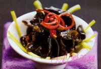 凉拌剁椒黑木耳 原料:黑木耳10朵、剁椒3汤匙、青葱2根、姜1小块、大蒜2瓣、白芝麻随意 调料:白糖1茶匙、...
