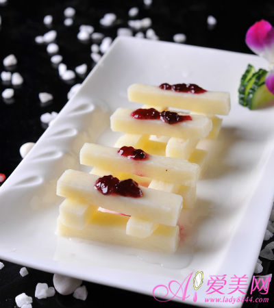 (1)山药洗净,放入锅内,加清水淹没山药为度,用旺火煮。待山药较烂时捞起,去皮,用刀剖成6厘米长、3厘米宽的长方形,拍扁。蜜枣一颗两半去核待用。