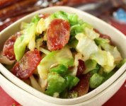 冬天快手菜 包菜炒腊肠的做法 主料:包菜,广式腊肠 调料:蚝油、生姜、大蒜、葱花 做法: 1.腊肠洗净斜切...