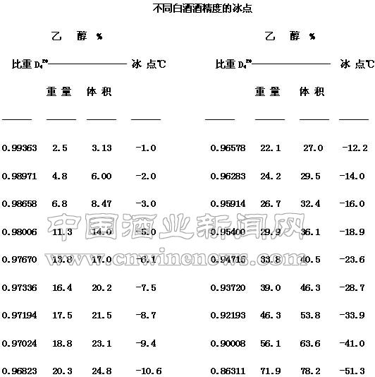 用冷冻过滤法生产低度白酒,温度非常重要。据国内外的实践证明:将降度后的白酒采取冷冻至该酒的冰点以上0.5℃-1℃为益。过去大都知道冷冻法生产低度酒,但对于品温的冰点却很少考虑。实践证明,消除冷凝物质是一个非常关键的技术问题。由于不同酒精度的冰点不一样,而且既没有周期性也没有规律性,因此,白酒的冰点只有通过试验确切掌握。有关方面的试验结果如表1所述。