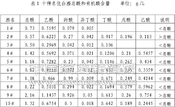 有人曾提出,用酒中测出的总酸值逐一减去气相色谱测出的各种有机酸,来计算乳酸的含量。但我们有时发现,气相色谱所测出的各种有机酸的总量(按乙酸计),大于或等于总酸,这就很难证明这种计算方法的可行性。我们对10种名优白酒做过这样一系列检测,见表1。