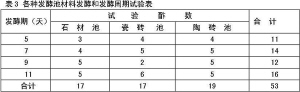 在德感酒厂生产车间的发酵池内,分别用陶砖、瓷砖和石料各砌4个发酵池,用同等操作方法和配料进行发酵试验(见表3)。