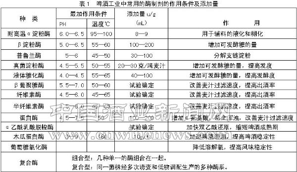 将现代生物技术与传统啤酒酿造技术相结合,不仅对稳定和提高啤酒质量有益,而且对降低生产成本、弥补麦芽质量缺陷、增加花色品种、增加效益都大有好处。酶制剂种类很多,功效不一,在啤酒生产过程中的使用工序也不一样。目前,啤酒生产中常用的酶制剂有:耐高温α-淀粉酶、糖化酶、蛋白酶、复合酶α-乙酰乳酸脱羧酶、复合酶等(见表一)。