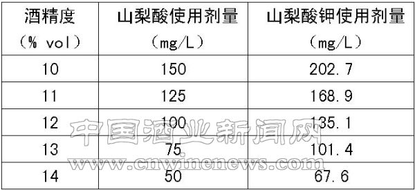 山梨酸是一种不饱和脂肪酸,无毒性,能被人体完全吸收。它具有特殊的抗酵母作用,是一种稳定的真菌抑制剂;它能够抑制葡萄酒酵母的繁殖,在隔绝空气时抑制效率更高;它能抑制酵母的糖发酵能力而不杀死它们。国家标准GB15037-2006《葡萄酒》中规定最大允许量为200mg/L,各级检验机构均可以检出山梨酸的存在和测定出它的添加量。但要注意的是,有些国家不允许进口经山梨酸处理过的葡萄酒,因此,在生产出口产品时一定要注意并了解清楚。山梨酸的抗酵母能力会因为乙醇的存在而大大加强,但山梨酸的溶解度较小。我们在实际生产过程中,常会遇到使用山梨酸钾的情况。笔者现按照标准规定的山梨酸的用量,换算成山梨酸钾的使用剂量,将在葡萄酒已经过除菌过滤后,山梨酸或山梨酸钾的建议使用剂量按酒度的不同要求列下表,供同行们使用时参考。