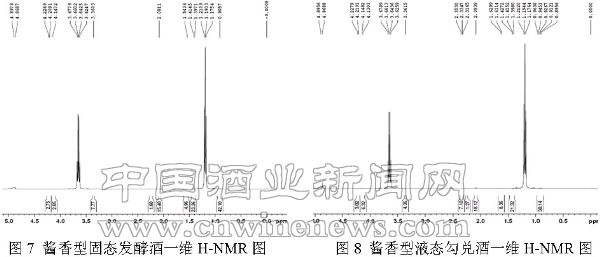 通过对三种香型的固态发酵酒与液态勾兑酒做一维H-NMR,进一步说明这些化学组成相同,但制酒工艺不同得到的酒在微观构成上存在着差异性。