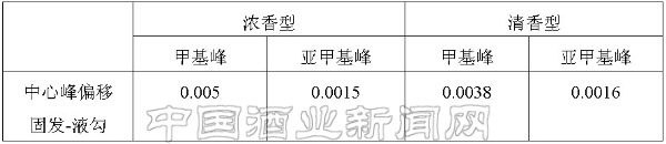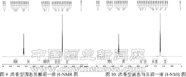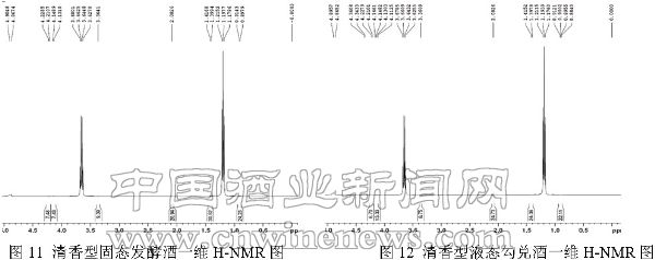 (2)从核磁图中我们还可以看到,浓香型的图9与图10,清香型的图11与图12,其甲基与亚甲基的中心峰位移固态发酵酒比液态勾兑酒均向左偏移(表1)。