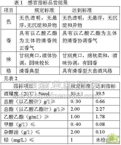 通过感官品尝和气相色谱分析相结合的方式,经过上百次的小样勾调试验,筛选出了既能突出清香风格,又照顾后味,酒体协调,并能基本解决各种质量缺陷的勾兑工艺,所勾兑出的样品经组织专业评酒委员品尝后一致认为,质量达到了预定的要求(见表1、表2)。