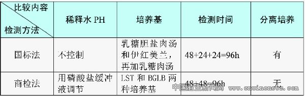 目前食品行业测定大肠菌群的方法有国标法(GB)、行标法(SN)和快速检测法(3M)。三种方法各有特点,其中,国家标准采用三步法:1)乳糖发酵试验:样品稀释后,选择三个稀释度,每个稀释度接种三管乳糖胆盐发酵管。36±1℃培养48±2h,观察是否产气。2)分离培养:将产气发酵管培养物转种于伊红美蓝琼脂平板上,36±1℃培养18h—24h,观察菌落形态。3)证实试验:挑取平板上的可疑菌落,进行革兰氏染色观察。同时接种乳糖发酵管36±1℃培养24±2h,观察产气情况。报告:根据证实为大肠杆菌阳性的管数,查MPN表,报告每100ml(g)大肠菌群的MPN值;行标法采用两步法:1)推测试验:样品稀释后,选择三个稀释度,每个稀释度接种三管LST肉汤。36±1℃培养48±2h,观察是否产气。2)证实试验:将产气管培养物接种煌绿乳糖胆盐(BGLB)肉汤管中,36±1℃培养48±2h,观察是否产气。以BGLB产气为阳性。查文章来源华夏酒报MPN表,报告每ml(g)样品中大肠菌群的MPN值。两种方法的比较结果见表2所示。