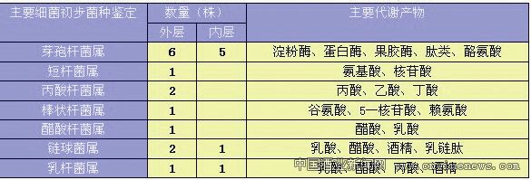徐坊芝麻香专用大曲的内层、外层的细菌、酵母菌、霉菌和放线菌的区系分布结果,徐坊芝麻香专用大曲外层和内层的主要细菌分布见表1、徐坊芝麻香专用大曲外层和内层的主要酵母菌分布见表2。