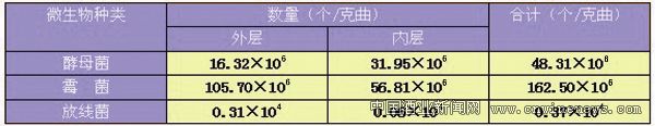 对芝麻香专用大曲的内层和外层分别取样,再分别采用稀释平板法分离、计数。