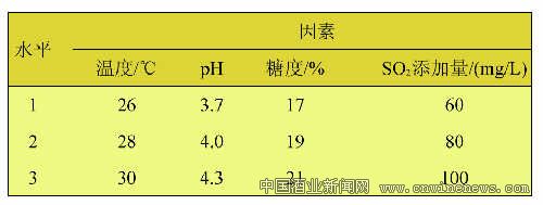 将石榴汁糖度调整为19%,pH调为4.0,分别选择SO2的添加量为40mg/L、60mg/L、80mg/L、100mg/L、120mg/L。接种等量石榴酒酵母,置于28℃下发酵。待不再产生气泡时停止发酵,测定其残糖和酒精度。正交试验因素水平测试。以温度、pH、糖度、SO2的添加量为因素,进行L9(34)正交试验(见表1),以确定各因素的最佳用量。