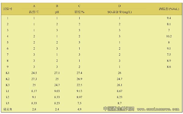发酵温度、pH、糖度(%)和SO2的添加量(mg/L)4因素正交试验结果见表2。