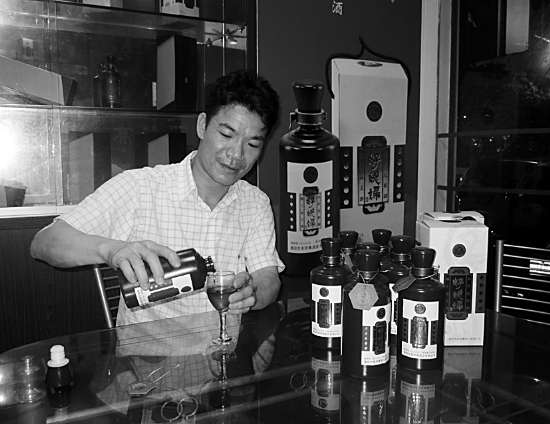 “糯米酒酿造方法简单,说穿了谁都可以动手自酿,但要酿得醇香粘绸,却是要花费一番功夫。”高老二向记者介绍了酿造方法。首先要选用优质的糯米,最好是潮汕本地的,江西产的虽然酿起来比较有成,但酿出来的味道却不如本地的。糯米蒸熟后要把它摊开来自然降温,当温度降到不烫手时,就可以洒下一定比例的酒曲,不断拌匀后就可以放进坛里,再加进米酒、红枣、枸杞后封住盖口,待其发酵。如果是天气比较凉,封坛后最好用领棉被把坛子包起来保温。“这样大概过了十天半月后,嘴馋者基本上就可以品尝了。”高老二透露说,目前市面上一斤十几二十元的糯米酒,基本上都是这样酿造,当然也有个别黑心的商家,直接用酒精竞白糖水再加进一些香精,一斤的零售价只有六、七元。但他绝对不采用这种快捷或者黑心的手段来赚钱,而是采取最“笨”的酿造工艺。封坛之后要让它发酵至少三个月以上,打开坛子后便会闻到一股扑鼻的“酱香”,之后取出进行压榨,把酒渣去掉,此时,酒液已经非常粘绸,颜色则呈枣红色,倒在杯里就会出现“挂壁”。此时的糯米酒才是真正意义上的潮汕糯米酒,不过此时的酒虽好,却无法贮存很久,还必须经过高温消毒。把酒液装在桶里,用蒸汽蒸上几个小时,之后进行沉淀、取液、再沉淀、再取液……最后就是封坛窖存。整套工序下来,足足耗费了将近一年时间,一坛醇香、地道的潮汕糯米酒才算大功告成。