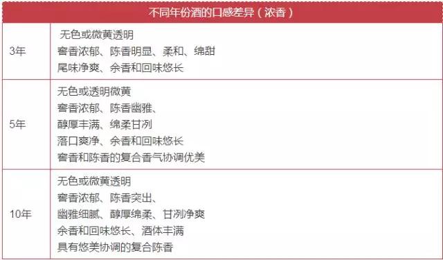 众所周知,"酒越陈越香"!但3年、5年、10年的老年份酒,在口感品鉴上有什么不同呢?或许下面这张表会令你找到答案。