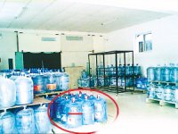 堆在仓库中的“名牌”桶装水 回收来的旧水桶 灌好水后贴商标 桶装水搬进仓库 目前,居家生活离不开桶装饮...