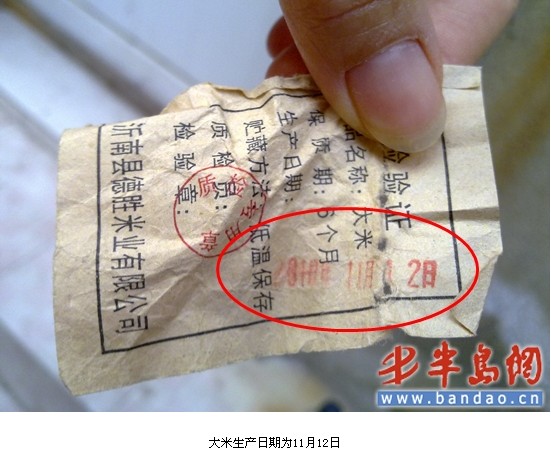 12月20日,记者在四方区小村庄见到刘女士,从她提出来的米袋中,可以很明显的看出这些大米的差别,与普通大米相比,这些大米颜色上稍显发黄、发绿,有明显的霉味。热水一冲后,淘米的水很快就被染成有些黄绿色。从米袋上,记者发现,这袋大米的生产日期是2010年11月12日,20℃以下可以贮存6个月。