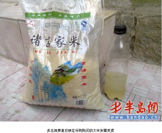 20日下午,又一位消费者杨女士反映说,她看到了半岛网友发的乐购大米出现问题的帖子,她也遇到了这种情况,产品也是“诸葛米家”的大米,问题同样是发霉的问题,淘出的米水发黄发绿,现在一直扔在家里,她打算这几天就找乐购讨一个说法。