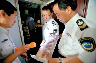 5月8日,山西运城市一名执法人员检查火锅店冷库的冻羊肉。新华社发