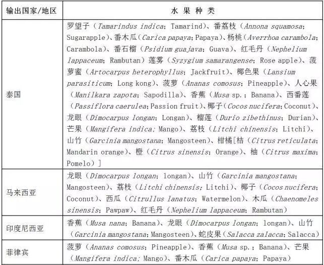 5月24日,质检总局发布了《获得我国检验检疫准入的新鲜水果种类及输出国家地区名录》(2017年5月11日更新),涉及泰国、马来西亚、印度尼西亚等43个国家和地区。详细情况见下表。