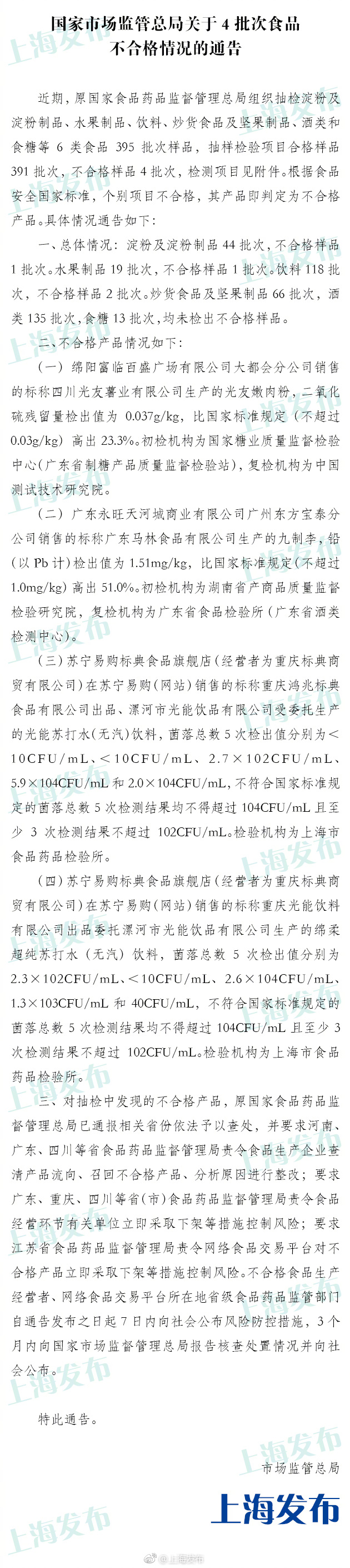 国家食品药品监督管理总局组织抽检淀粉及淀粉制品、水果制品、饮料、炒货食品及坚果制品、酒类和食糖等6类食品395批次样品。其中,苏宁易购标典食品旗舰店(经营者为重庆标典商贸有限公司)标称重庆鸿兆标典食品有限公司出品、漯河市光能饮品有限公司受委托生产的光能苏打水(无汽)饮料等4批次不合格。不合格项目为菌落总数超标等。详见↓