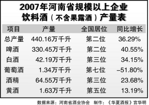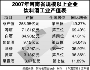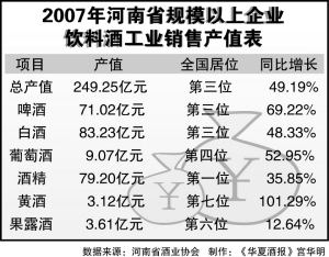 熊玉亮表示,2007年豫酒复兴的步伐加快了。河南省酒业协会2007年度工作报告显示,2007年,河南省规模以上企业饮料酒总产量(不含果露酒)、实现工业总产值、实现工业销售产值见表。