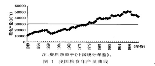 自建国以来,我国粮食生产不断发展,产量不断提高。见图1:(注:此图来源于自然资源学报《基于EMD的我国粮食产量波动及其成因多尺度分析》一文)